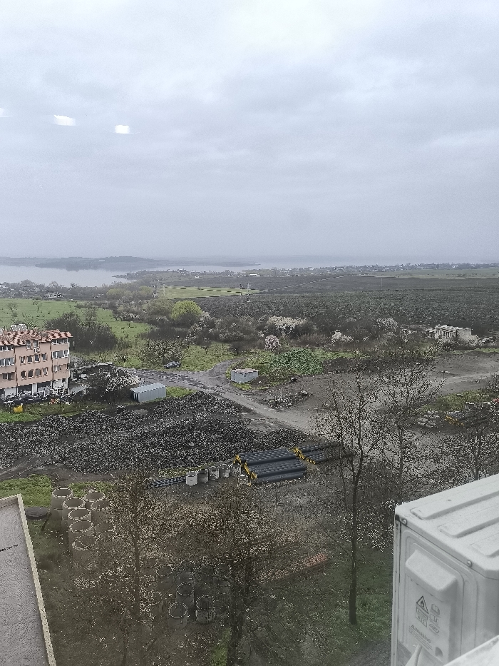 This image presents an elevated, wide view of an industrial and semi-rural landscape in Burgas, Bulgaria, under a uniformly overcast, light-gray sky. In the immediate foreground, the top corner of a light-colored building structure is visible on the bottom left, and a white, rectangular external air conditioning unit with visible warning labels is partially present on the bottom right. The mid-ground features a complex scene. To the left, a multi-story residential building with a reddish-brown tiled roof and light-colored facade stands, with several vehicles parked at its base. Adjacent to this building and extending into the center are extensive piles of dark, crushed aggregate or rubble. Amidst this area, stacks of black pipes with yellow banding are horizontally arranged, and circular concrete culverts or rings are vertically stacked. Several small, gray, corrugated metal sheds are visible, connected by unpaved dirt paths. Scattered deciduous trees, some in early bloom with white or light pink blossoms and others still bare, are dispersed across the landscape. Patches of green vegetation and dark soil are interspersed throughout. In the background, a large body of water, consistent with a lake or bay, extends horizontally across the image, reflecting the muted sky. The far shore is lined with a mix of green fields, agricultural plots, and low-density residential or industrial structures. No human figures are discernible anywhere in the scene.