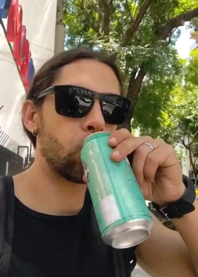 A man with shoulder length hair and a goatee, wearing sunglasses, a black tank top, and a black backpack, is drinking from a light blue and silver can. He is standing on a sidewalk with trees overhead. A building with some red signage is visible behind him to his left, and a yellow taxi cab is visible further back on the right. He pauses after taking a drink and looks into the camera.