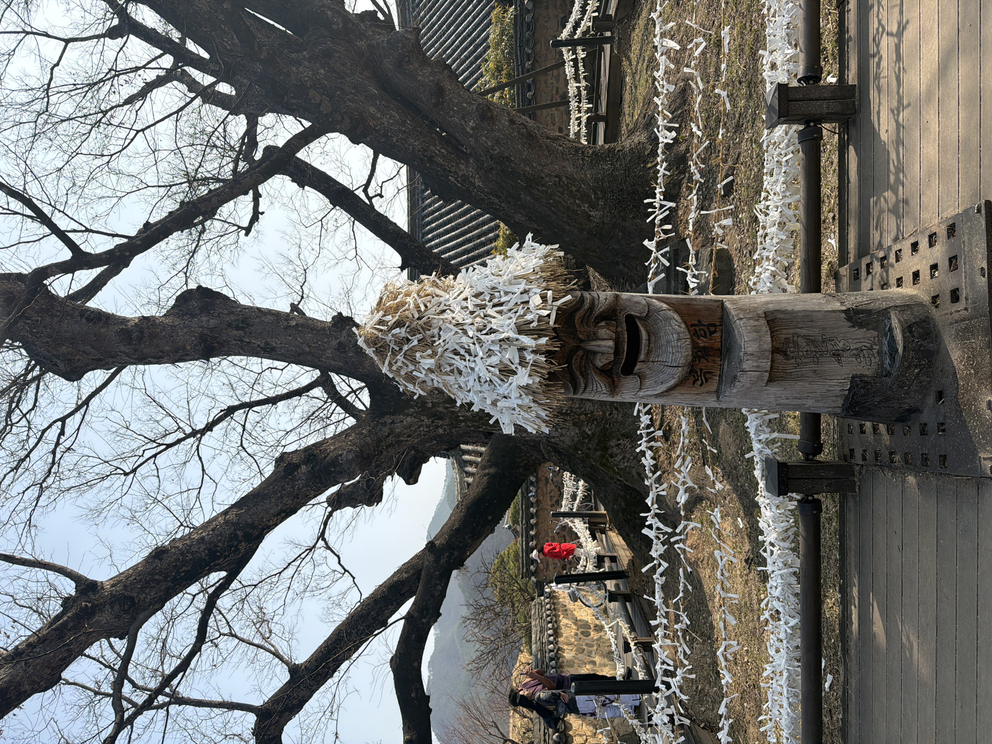 The image displays a carved wooden Jangseung (Korean totem pole) standing prominently in the foreground within Hahoe Folk Village, Andong-si, South Korea. The Jangseung features a carved, smiling face and Korean script below, topped with a conical thatched straw cap densely covered in numerous white paper strips. Behind the Jangseung, several large, leafless deciduous trees with thick, dark trunks and branches extend upwards, filling a significant portion of the frame against a clear, pale blue sky. Multiple horizontal lines of white paper strips are strung between dark wooden posts, encircling the area around the trees and the Jangseung, forming a visible barrier. A dark wooden boardwalk occupies the immediate foreground, leading towards the Jangseung. To the left, behind a low stone wall with traditional tiled coping, three individuals are present. Two individuals, one in white trousers and a dark top, and another in a purple top, are positioned near the wall, seemingly engaged in photography with a mobile phone. A third person, wearing a red coat, walks further back along a similar wooden pathway. Beyond the stone wall, traditional Korean tiled rooftops are partially visible, with mountains rising in the distant background under a bright sky.