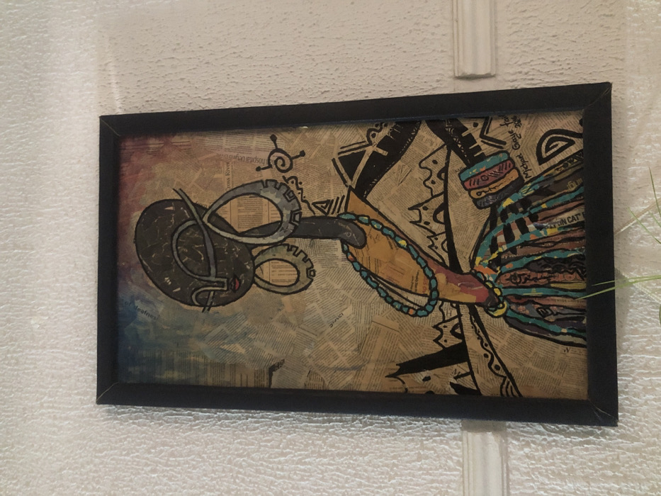 A vertically oriented, framed mixed-media artwork is mounted on a textured white wall in Bauchi, Nigeria