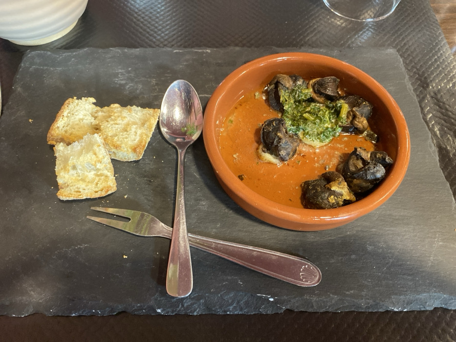 This overhead image depicts a partially consumed meal served on a dark gray, rectangular slate-like platter in a restaurant setting in Strasbourg, France. The central item is a terracotta-colored ceramic bowl containing several dark-shelled items, consistent with escargots, partially immersed in a green herb sauce or butter. Residue from the sauce is visible on the interior of the bowl. Three irregular pieces of lightly toasted, golden-brown bread are scattered on the platter above the bowl. A silver-colored metal fork with two tines, featuring a seashell design etched into its handle, rests horizontally on the platter, partially overlapping a silver-colored metal spoon positioned vertically beneath it. Both utensils display minor surface scratches. The slate platter is situated on a dark-toned tabletop, which exhibits a subtle textured pattern on the right side. A portion of a clear glass is visible on the lower right, and a white ceramic item is partially visible in the upper right background.
