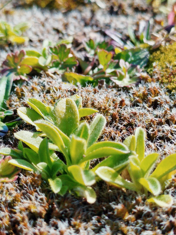 The scene depicts a close-up, ground-level view of various low-lying vegetation in Klenovik, Bulgaria. In the foreground, a cluster of small herbaceous plants with light green, ovate, and visibly fuzzy leaves is prominent. The mid-ground and background feature dense patches of brown-orange moss, interspersed with numerous fine white, hair-like fibrous growths. Additional small green plants with diverse leaf structures, including some with lobed leaves and reddish tints, are scattered throughout the frame. A patch of vibrant yellowish-green moss is visible on the far right. The scene is illuminated by direct sunlight. No human figures, animals, or man-made structures are present.