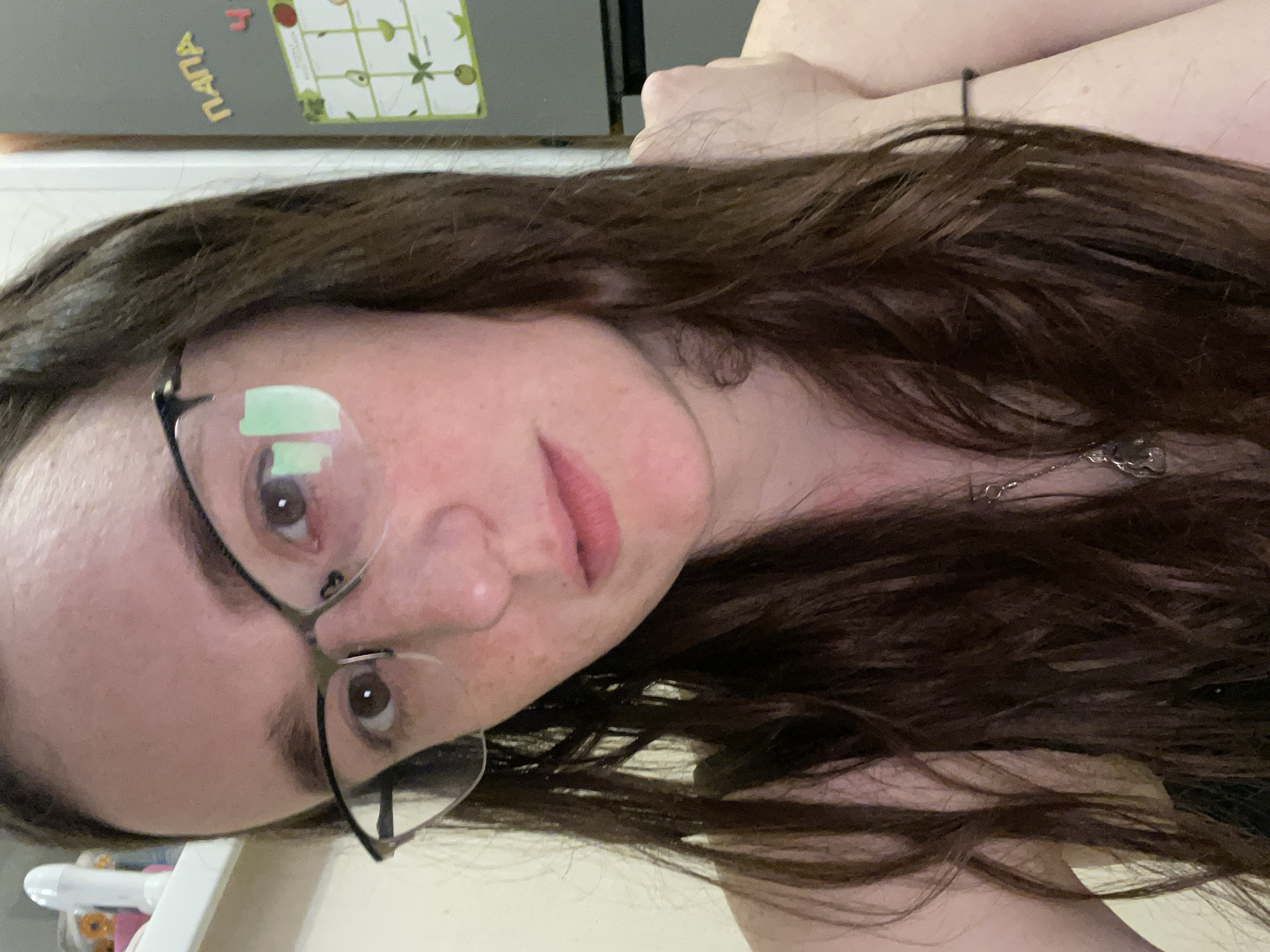 A medium close-up shot of a woman with brown hair wearing glasses and a silver necklace. The background features a refrigerator with a magnet that includes the word "mama" in Russian. The location in the city of Podstepki, Russia is not verifiable from the image.