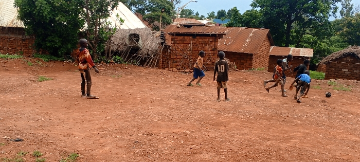 An outdoor scene in Kundu 1, Democratic Republic of the Congo, depicts seven young males engaged in football on a reddish-brown dirt field