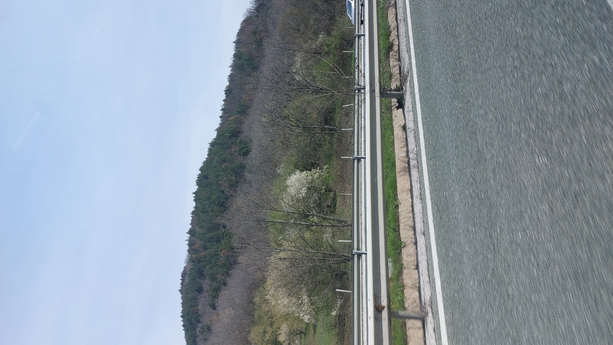 view from a moving vehicle on a highway near Pravets, Bulgaria. A forested hillside rises to the left of the road. A metal guardrail separates the highway from the shoulder, where some vegetation is visible. The highway surface is gray. The sky is light blue with a few clouds.