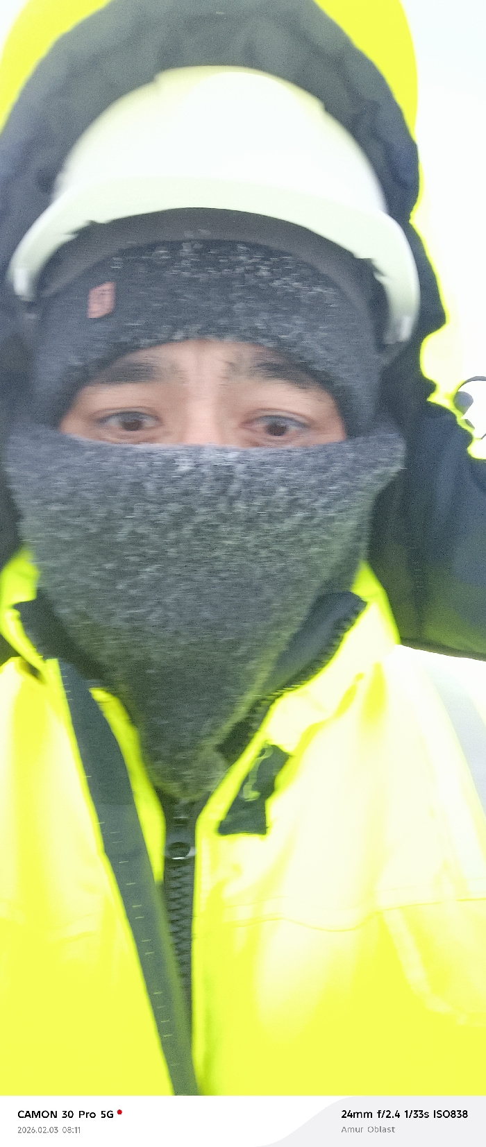 A close-up shot shows a person bundled up in winter gear. The individual wears a white hard hat, a gray knitted hat, and a gray scarf covering the lower part of their face, revealing only their eyes. They are also wearing a bright yellow jacket with a black zipper. The text overlay indicates that the photo was taken with a CAMON 30 Pro 5G, with specific camera settings and location information (Amur Oblast) noted. The date is 2026.02.03, at 08:11.