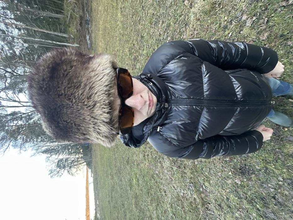 A single individual stands in an outdoor, natural environment within Boda, Sweden. The person, appearing young, is centered in the frame, facing the camera directly from a slightly elevated perspective. They wear a large, shaggy brown fur hat, rectangular tortoise-shell patterned sunglasses, a black shiny puffer-style winter jacket with a hood, blue denim jeans, and green rubber boots. The individual's mouth is visibly pursed in a slight frown, and both hands are clenched into fists at their sides. The ground consists of sparse, dry grass with scattered dead leaves. In the background to the left, a body of water is visible under a light, overcast sky, bordered by a treeline composed of mixed deciduous and coniferous trees. A small, dark patch of disturbed earth or ashes is present on the ground near the treeline on the right side of the image.