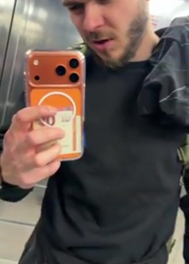 A man with a beard is standing in an elevator. He is holding his phone up to the camera. The phone has a clear case on it with an orange backing. There is a 10 Euro bill visible inside the phone case. The man appears angry and says, "Du, the card, work, bitch." The elevator is brightly lit with reflective stainless steel walls.
