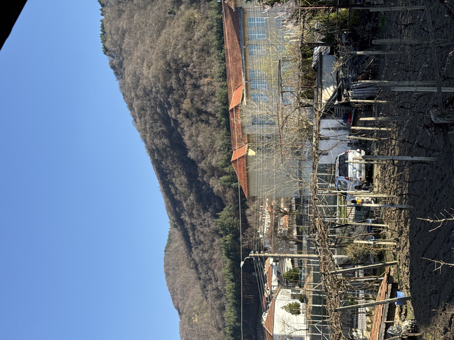 This image depicts a detailed view of Kolarovo, Bulgaria, under a clear blue sky. The foreground features a cultivated plot of land, likely a vineyard or garden, with numerous bare vines trained on wooden and concrete trellises and posts. The soil is dark and tilled. To the left, a small, weathered wooden shed is partially visible. Further right, a larger, cluttered outbuilding or shed stands. A silver SUV is parked directly behind the foreground plot, to the left of the larger outbuilding. In the midground, beyond a wire fence, several residential houses with light-colored facades and reddish-orange tiled roofs are visible. Overhead utility lines crisscross the scene, supported by wooden poles, and a street light fixture is present. A prominent two-story building occupies the center-right midground. It features a light-colored facade, a distinctive multi-gabled roof with orange tiles, and multiple rectangular windows on its upper floor, suggesting a public or institutional building. The background is dominated by a large, steep mountain rising towards the right, extensively covered with bare deciduous trees, indicating a late winter or early spring season. A distinct band of evergreen conifer trees runs along the lower slopes of the mountain. Bright sunlight illuminates the scene, casting shadows consistent with a mid-morning or afternoon sun angle. No individuals are present within the frame.