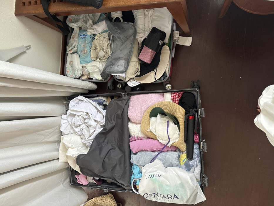 Two suitcases, both open and full of various items, sit on the floor. The top suitcase is under a wooden table and contains diapers, clothes, and a baby monitor. The bottom suitcase has a mix of folded clothing, towels, a sun hat, and a bag with "CENTARA" printed on it. Light-colored curtains are visible on the left side of the image and a portion of a chair on the right.