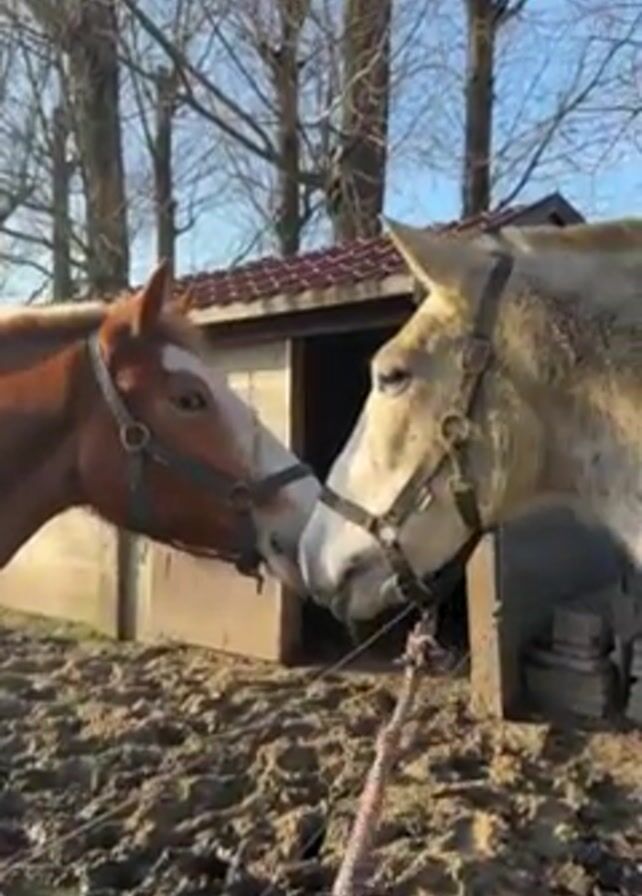 two horses standing near a muddy field. One horse is reddish-brown, and the other is light gray. They are both wearing halters. The reddish-brown horse is wearing a blanket. Behind the horses is a small wooden structure with a red roof. A rope is visible between the horses. In the background are bare trees against a blue sky.
