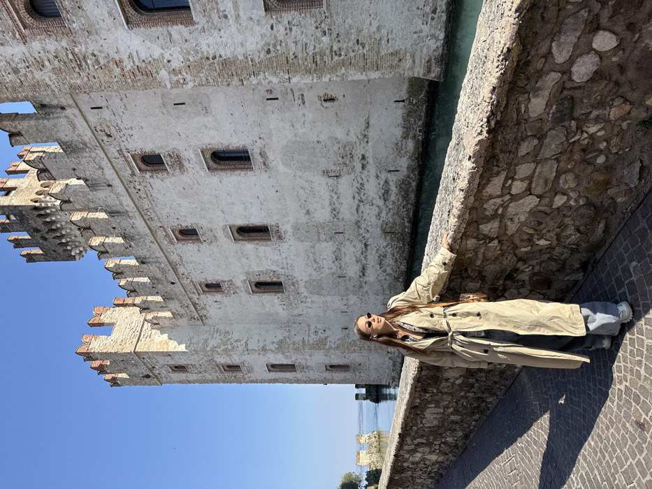 An outdoor scene captures a sole female subject on a paved path adjacent to a stone wall, with the Scaliger Castle in Sirmione, Italy, prominently featured behind her