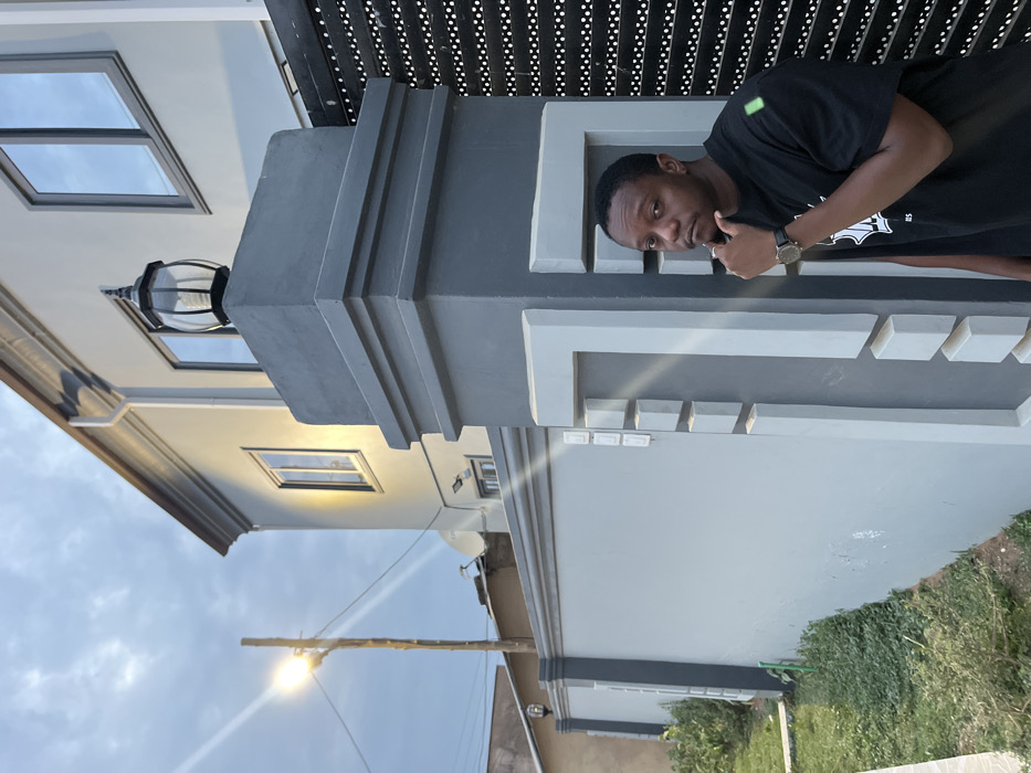 A man poses with a thumbs-up gesture next to a gray building pillar. The pillar is part of a structure with rectangular molding details on its facade. The building itself is a light gray color and features several windows. Above the man and pillar is a patterned metal covering. A street light and some greenery are visible below, against a cloudy sky.