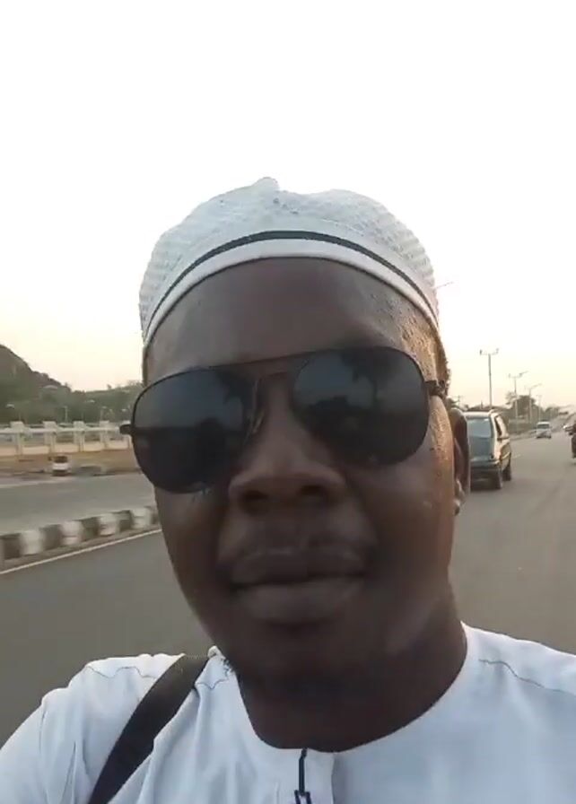 A man wearing sunglasses and a white patterned hat is filming himself on a road. He's wearing a white shirt, and a strap is visible over his left shoulder. In the background, cars and motorcycles are moving on the road, along with what appears to be a streetlight and some low-lying buildings. The sky is bright but looks slightly overcast. The camera is shaky, suggesting he is moving. There is significant wind noise.