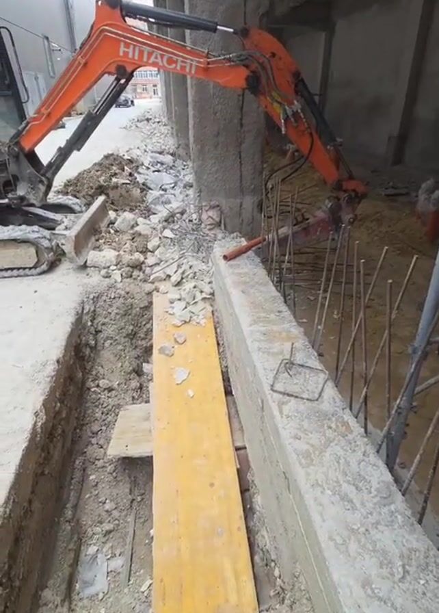 The video depicts a construction site where a Hitachi excavator is being used to break concrete. The excavator, colored orange and black, is positioned partially under the structure of a building, with its arm extended to work on a section of concrete. Around the excavator are piles of rubble and debris. A trench runs alongside the building, with a wooden board placed across it. Rebar is visible in the ground near the concrete being broken. The overall environment is dusty and industrial, indicative of ongoing construction or demolition work.