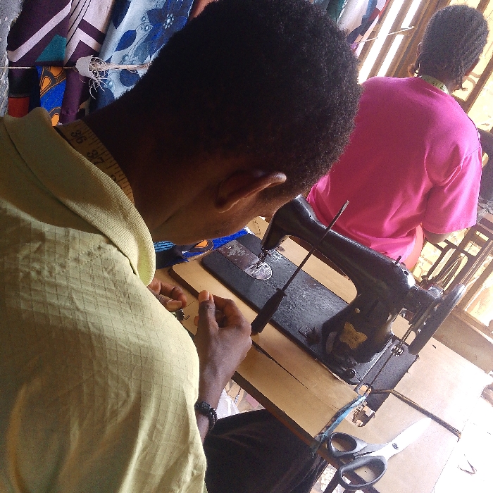 - "An overhead-angle image captures an individual focused on operating a black, vintage-style manual sewing machine mounted on a light wooden table within what appears to be a tailoring workshop in Nsugbe, Nigeria" by FM-NMmnI2, licensed under CC BY 4.0
