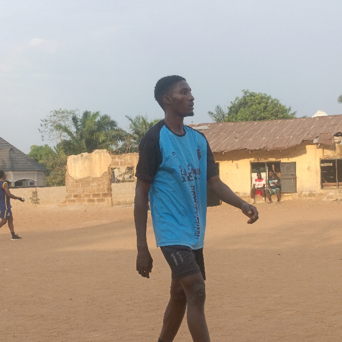 The image depicts an outdoor scene in Akwanga, Nigeria, characterized by a reddish-brown dirt ground under a pale blue sky