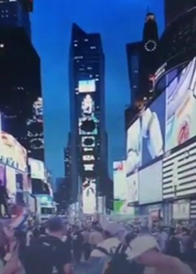 crowded Times Square in New York City at night. The sky is dark blue. Tall buildings surround the square, illuminated with bright digital billboards. People are walking around, and there is a general sense of hustle and bustle. Some individuals are carrying flags.