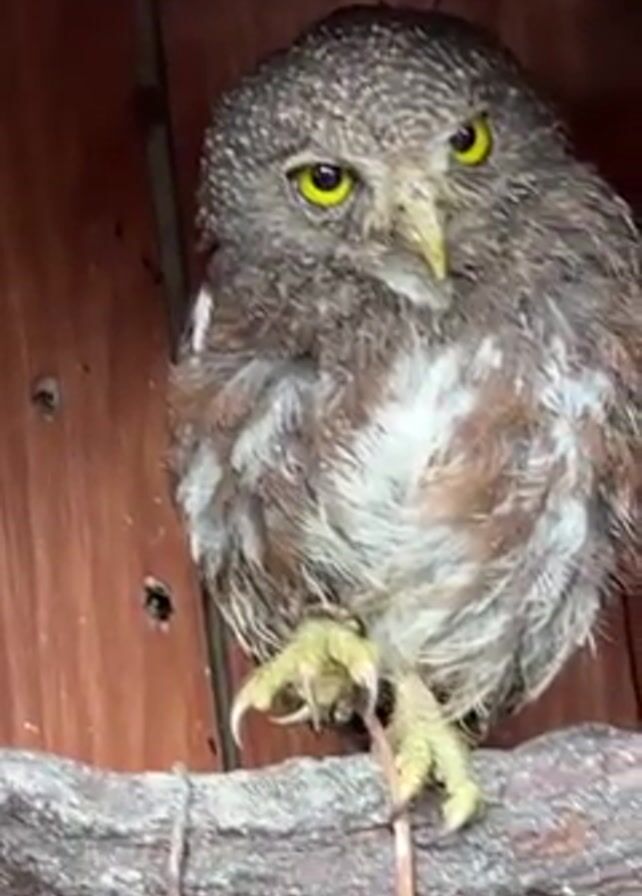 An owl is perched on a branch inside a wooden birdhouse. The owl is gray and brown with yellow eyes and talons. The owl turns its head and preens its feathers with its beak and talons. The birdhouse is made of wood and has a round opening. There is indistinct speech audible.