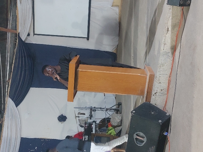A man in black speaks into a microphone while standing behind a wooden podium. The backdrop includes a screen and draped fabric in shades of blue and white. A speaker sits to the right of the podium. A microphone stand and other equipment are visible in the lower portion of the image.