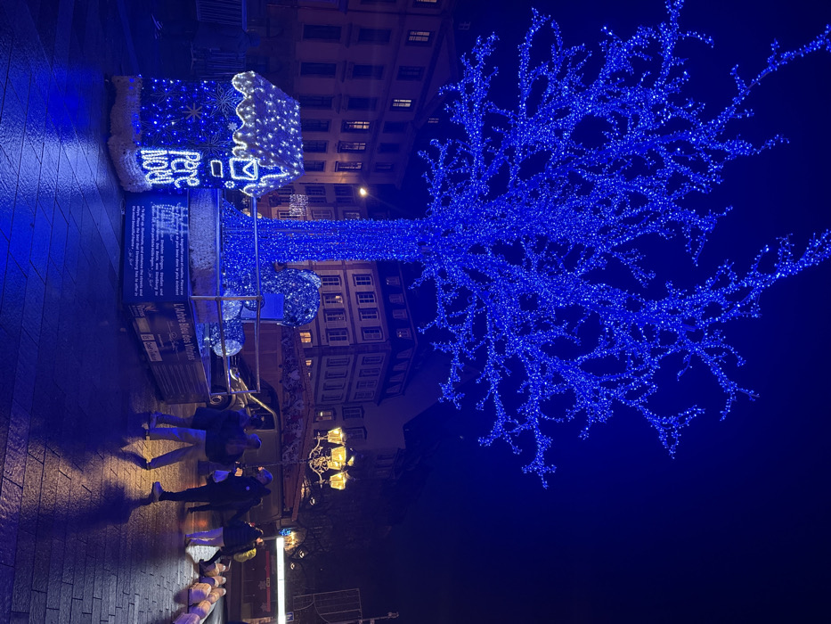 A night scene captures Strasbourg's Christmas decorations. A tree adorned with blue lights stands tall. People walk along the street, their shadows cast by nearby lampposts. Buildings with multiple windows are visible in the background. A decorative structure with white and blue lights adds to the festive atmosphere.