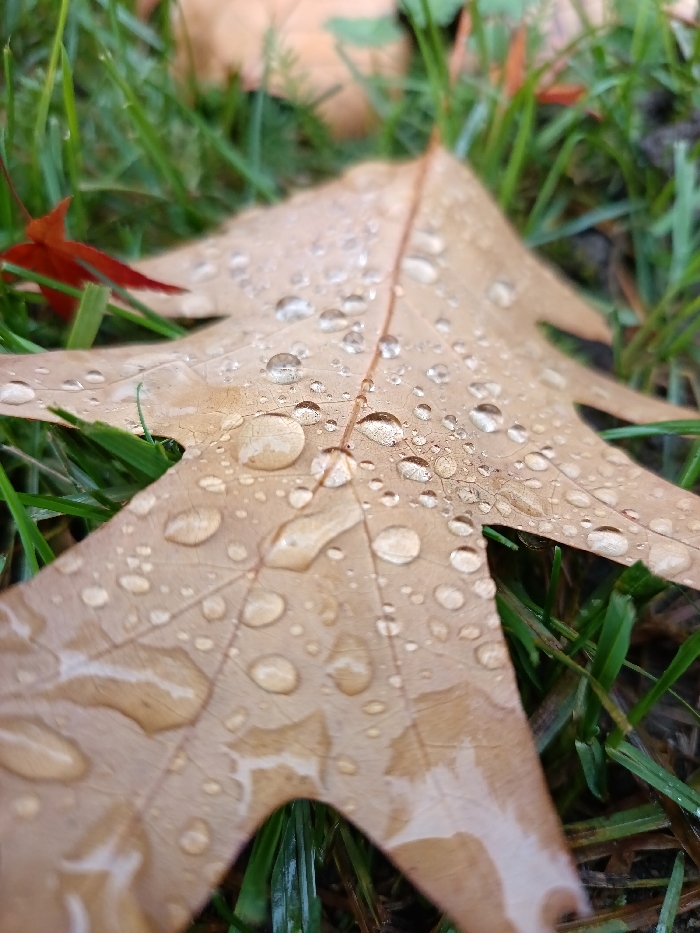A close-up, low-angle photograph captures a single, light brown, lobed leaf, consistent with an oak leaf, positioned on a bed of green grass. The leaf's upper surface is densely covered with numerous spherical water droplets of varying sizes, reflecting ambient light. The central vein and branching secondary veins of the leaf are distinctly visible beneath the water droplets. The surrounding green grass blades are also wet, with some individual water droplets visible. In the out-of-focus background, additional brown leaves and a smaller, reddish leaf are discernible. The scene depicts a natural outdoor environment following precipitation or heavy dew. No individuals or specific actions are observed. The precise location within Leipzig, Germany, cannot be determined from the visual information presented.