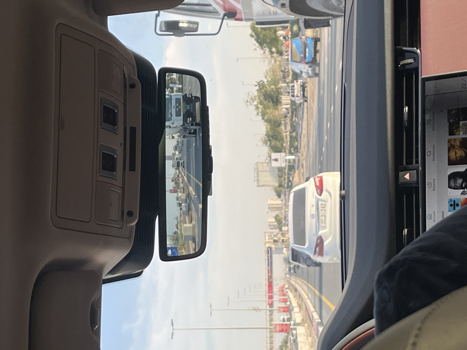 The scene depicts a view from the interior of a vehicle on a multi-lane highway in the United Arab Emirates, specifically identifiable as Umm Al Quwain by the "C" prefix on the license plate of a vehicle ahead. The time is daytime, under a clear sky with scattered clouds. In the foreground, the beige overhead console of the camera vehicle is visible, along with a black dashboard featuring air vents, a red hazard light button, and a large central infotainment touchscreen displaying applications and media (including images of individuals, with some interface text in French). A person's arm, dressed in dark fabric, is partially visible in the lower-left. Centered in the midground is a digital rearview mirror, displaying a live feed of the road behind. A white MAN brand concrete mixer truck is prominently visible directly behind the camera vehicle in this mirror, followed by other distant vehicles. To the immediate right, outside the digital mirror, the side mirror and a portion of the cab of another large industrial truck are visible, suggesting its proximity to the camera vehicle. Through the windshield, ahead of the camera vehicle, a white Nissan Altima sedan with UAE license plate "C 51242" is observed in the same lane. Behind it, a dark sedan follows. The highway features asphalt paving with distinct yellow and white lane markings. To the right, a sandy median with scattered low vegetation and concrete barriers separates the road. Streetlights line the highway, and an overhead gantry with red banners spans the road in the distance. Further right, off the main lanes, a white pickup truck and a blue and black utility van are visible. In the background, urban buildings and structures are discernible on the horizon.