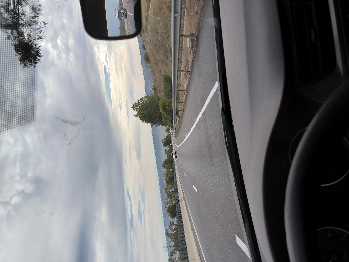 A view from inside a vehicle driving on a highway. The road curves slightly to the left, with a white line marking the edge. A side mirror shows another vehicle further down the road. The sky is cloudy with streaks of blue visible. A hillside with vegetation runs along the right side of the road. The interior of the vehicle, including the dashboard and steering wheel, is visible.