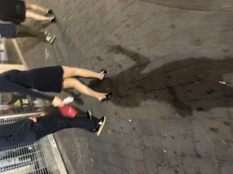 The scene captures a nocturnal street in a commercial district of Boston, United States, featuring a paved sidewalk constructed from rectangular paver stones. Two primary subjects are in motion, walking from left to right. The subject on the left wears dark trousers and black sneakers with white soles and a white star emblem; they hold a red bag and a white item in their left hand. The subject on the right wears a dark dress, nude hosiery, and black slingback high-heeled shoes with a frontal embellishment; they hold a red bag and a white item in their right hand. In the blurred background, storefront reflections are visible, including a merchandise display behind a partially lowered metal security gate on the left. Other pedestrians are faintly discernible further down the street. A prominent, elongated shadow, consistent with that of the photographer, is cast on the damp pavement in the foreground, with a discernible raised arm.