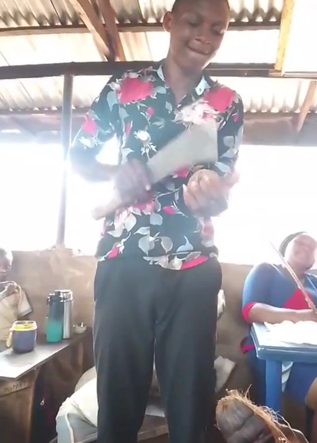 young man standing indoors, holding a machete in his right hand and a coconut in his left