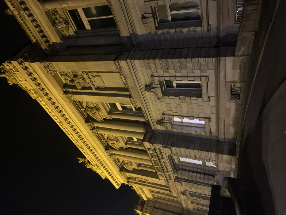 An upward-angled shot captures the facade of a grand, old building at night. The structure exhibits intricate architectural details like columns, moldings, and decorative elements. Windows dot the facade, some showing hints of light. The lower section is illuminated in yellow, while the top is in a dull grey. To the right of the facade, part of a dark structure is visible.
