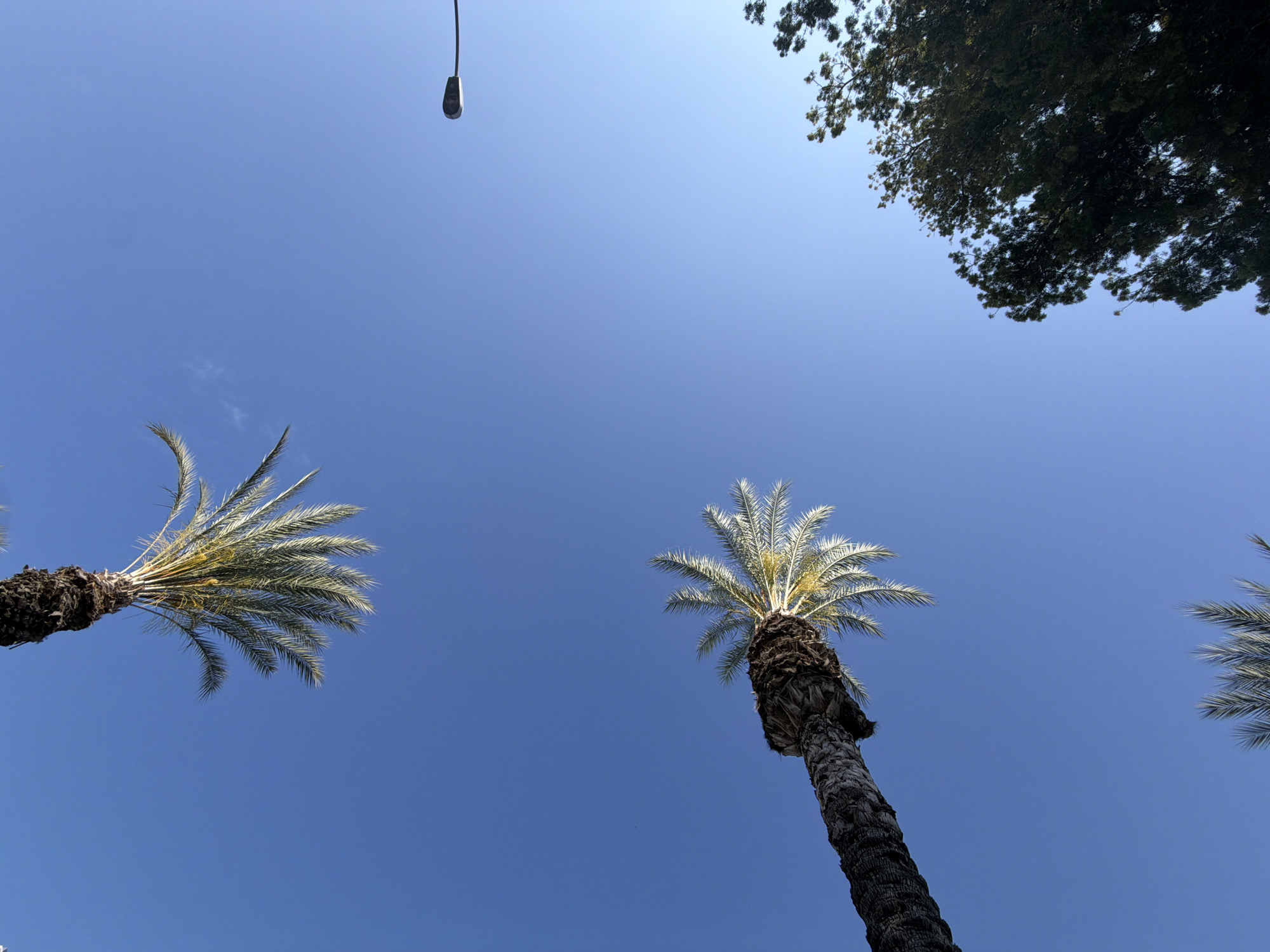The image displays an upward-looking perspective of a clear, bright blue sky in Pasadena, California, United States of America. Three distinct palm trees are visible. One prominent palm tree trunk with green fronds extends diagonally from the lower-left toward the center, its fronds illuminated by direct sunlight. A second palm tree's fronds are partially visible in the upper-left corner, pointing downwards. A third set of palm fronds is present at the bottom-center. In the upper-right quadrant, a black streetlamp fixture with a dark arm extends from the frame's edge. A dense canopy of a broadleaf tree, distinct from the palms, occupies the lower-right portion of the frame. The scene is devoid of people or discernible actions.