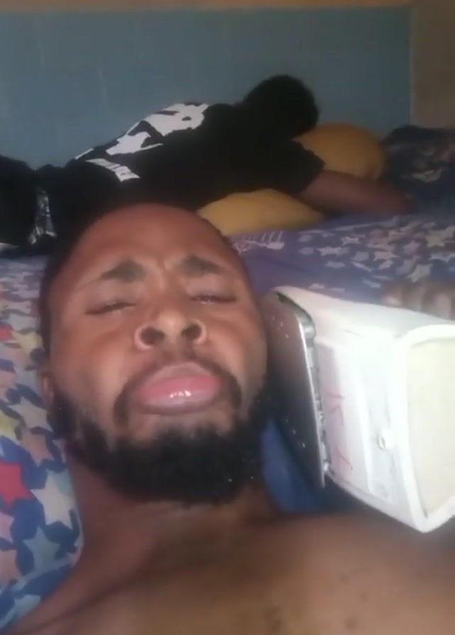 A man with dark skin, a short haircut, and a beard lies on a bed, holding a white object. He sticks his tongue out and seems to be making a face. Another person, dressed in black, is lying on the bed behind him. The bed has a blue and patterned sheet, and there are yellow pillows nearby. The wall is a combination of yellow and blue.