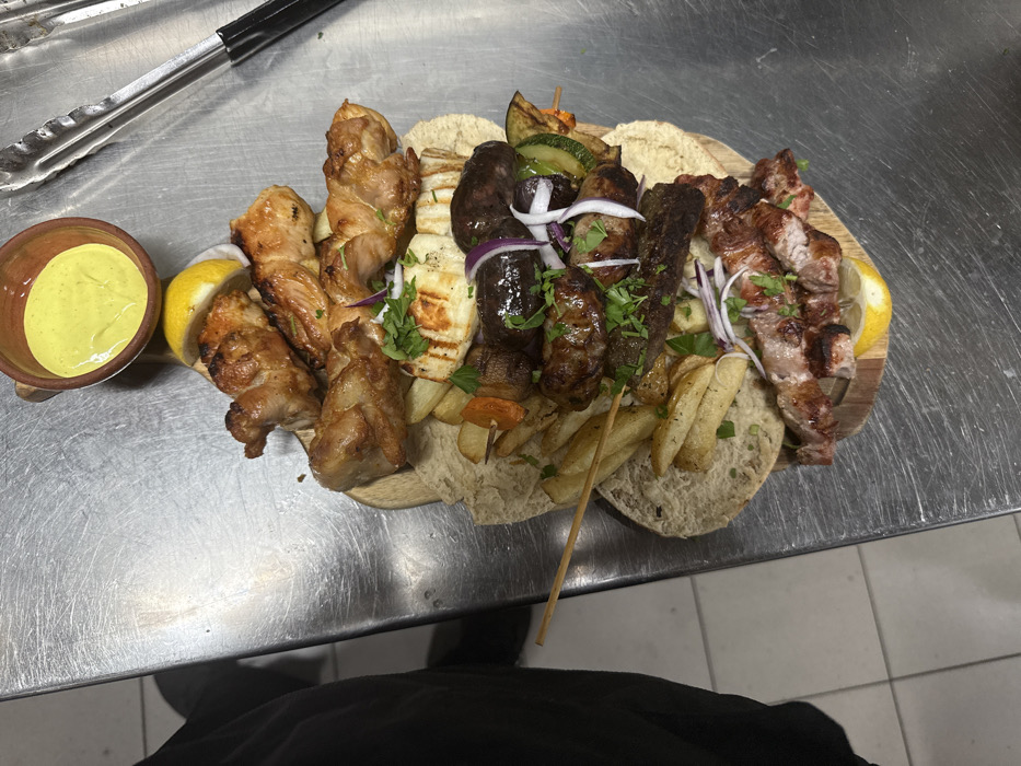 The scene depicts a commercial food preparation or serving area within an establishment in Paralimni, Cyprus. A large, irregularly shaped wooden platter, approximately 50-60 cm in length, is centrally positioned on a brushed stainless steel countertop. The platter holds an extensive array of grilled items. From top to bottom, these include: 1. Multiple pieces of grilled chicken, characterized by golden-brown skin. 2. A rectangular piece of grilled halloumi cheese, displaying distinct grill marks, garnished with chopped herbs. 3. Two skewers containing dark, grilled sausage-like items, interspersed with sliced red onion and chopped herbs. 4. One skewer with lighter-colored grilled meat or sausage segments. 5. One skewer with grilled vegetables, specifically visible pieces of zucchini and a carrot slice. 6. A substantial portion of thick-cut French fries. 7. Multiple skewers with grilled pork or similar meat, garnished with sliced red onion and chopped herbs. The entire food arrangement rests on a base of several flatbreads, resembling pita. Multiple lemon wedges are strategically placed throughout the platter, notably beneath the top chicken and the bottom grilled meat. To the upper right of the platter, a small, terracotta-colored ceramic bowl contains a pale yellow, viscous sauce. Adjacent to this bowl, a pair of stainless steel tongs with black handles lies on the countertop. The countertop itself exhibits wear and minor scratches, consistent with a high-traffic kitchen environment. In the background on the left, the lower portion of a person's leg, clad in black trousers and a black shoe, is partially visible. The floor beneath this area consists of light-colored square tiles.