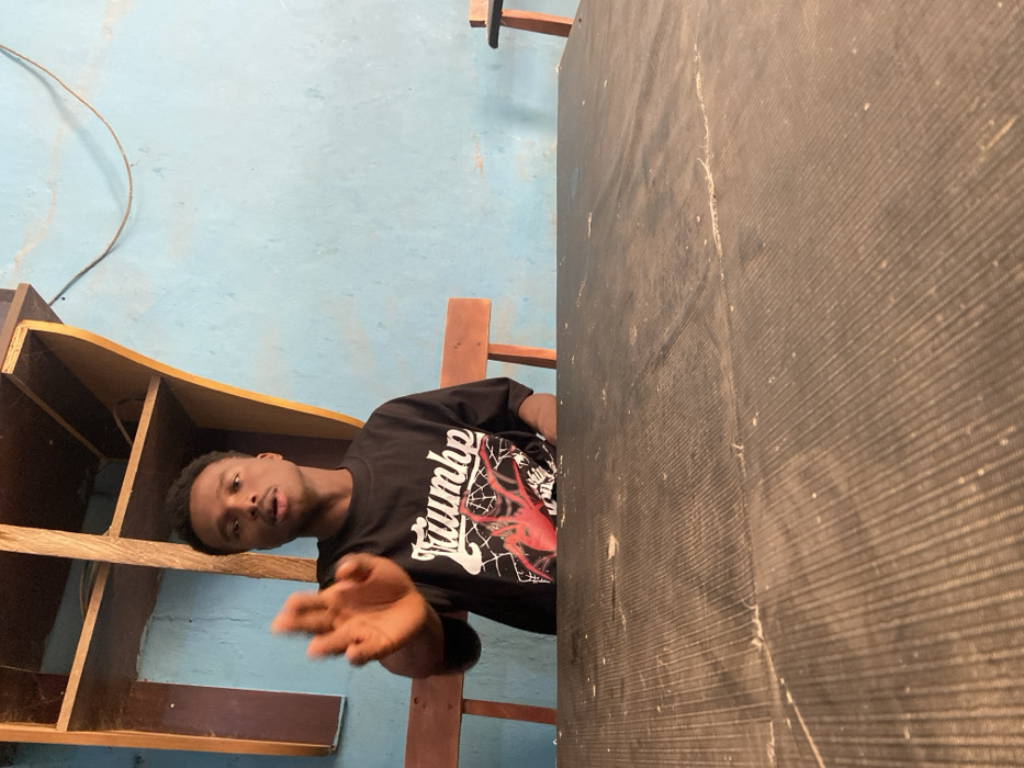 An interior scene in Ipetumodu, Nigeria, features a young adult male seated at a dark, textured table, which occupies the lower half of the frame. The male, positioned centrally, wears a black t-shirt with a "Triumph" logo and a red spider graphic. He is looking directly forward, mouth slightly open, and has his left hand raised in a gesture with the palm facing outward and fingers slightly curled. Behind him, a light blue wall shows signs of wear and discoloration, with a dark wire running horizontally. A multi-compartment wooden shelf unit is mounted on the wall to the upper left. Parts of two wooden chair backs are visible behind the male on either side. The table surface exhibits a distinct ribbed pattern, dust, and light-colored debris.