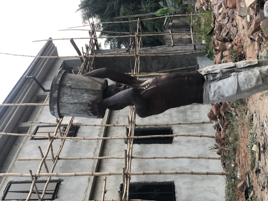 An adult male, shirtless and wearing soiled light-colored cargo pants, carries a grey cylindrical bucket balanced on his head, steadying it with both raised hands. A gold-colored chain with a cross pendant hangs from his neck, and liquid streaks are visible on his torso. The scene is set in Enugwu-Ukwu, Nigeria. Behind the man is a multi-story building under construction, its light grey walls adorned with extensive bamboo scaffolding and dark-framed windows. A black downspout is visible on the building's upper right. The foreground and mid-ground consist of reddish-brown dirt, scattered with rocks, rubble, and sparse green vegetation. Dense green trees form the background under a diffused, overcast sky.