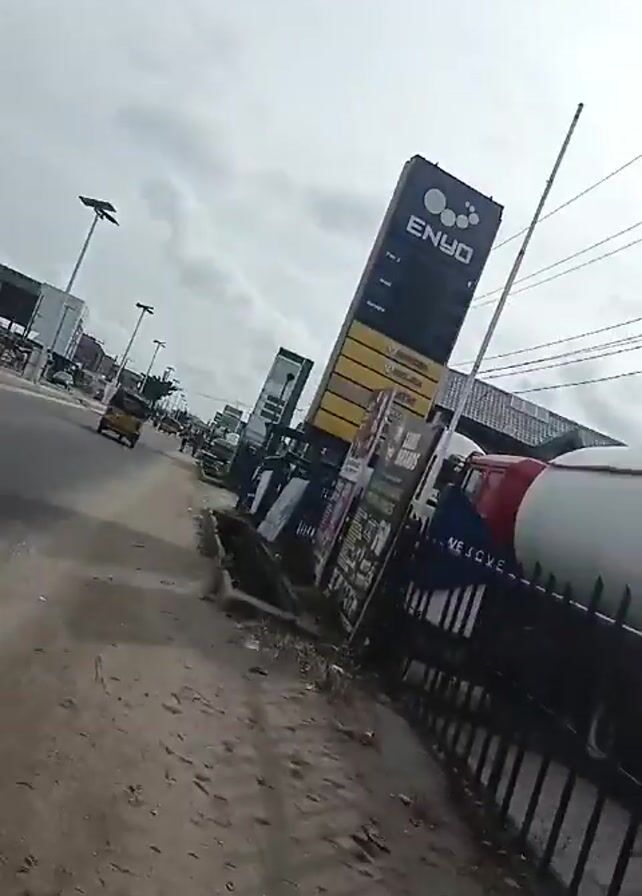 The video depicts a street scene on a cloudy day. The camera is stationary, positioned on a dirt shoulder adjacent to a paved road. A yellow three-wheeled vehicle drives down the road away from the camera. People are walking in the distance on the road. On the right of the frame, there is a large gas station sign that says "ENYO". There is also a cement drainage ditch next to the dirt shoulder. Several billboards are propped up along the shoulder. On the left of the frame, there are buildings and parked vehicles, including a white van. Streetlights are visible along the road.