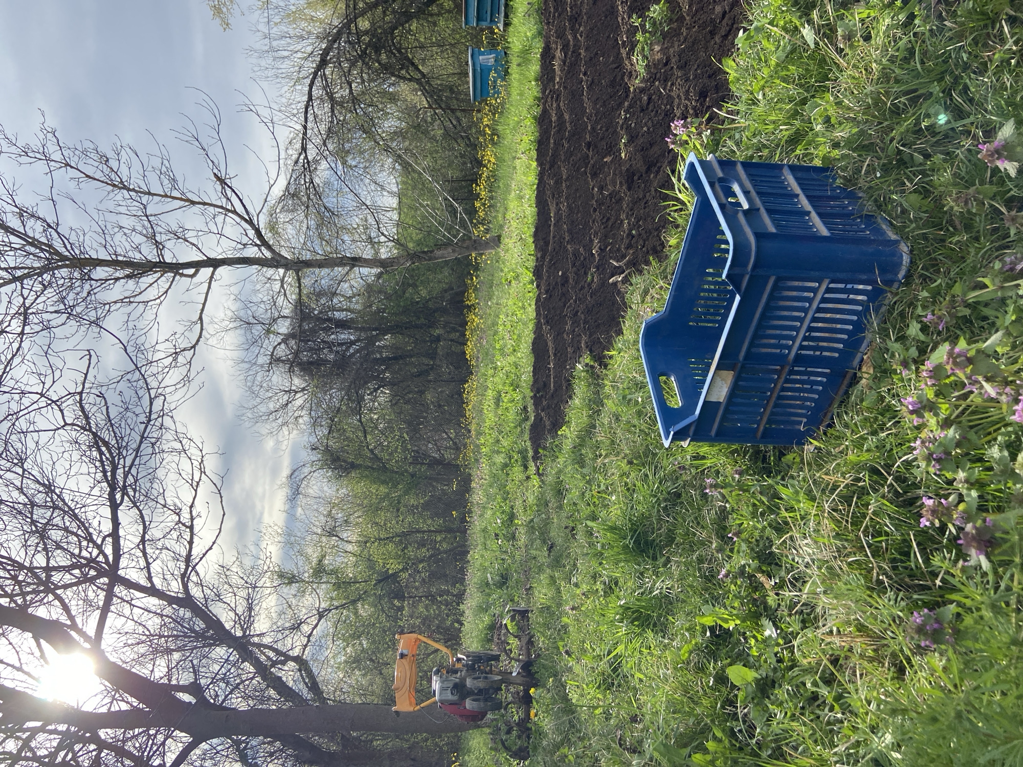 The image depicts an agricultural scene, possibly a farm or garden, in the Mindia, Bulgaria area. In the foreground, a blue plastic crate rests in a grassy area with purple flowers. Behind the crate, freshly tilled dark soil is visible. A small, yellow garden tiller is positioned in the grass near a tree with bare branches. In the background, trees line the horizon, and blue beehives are visible. The sky is partly cloudy, with the sun shining through the trees.