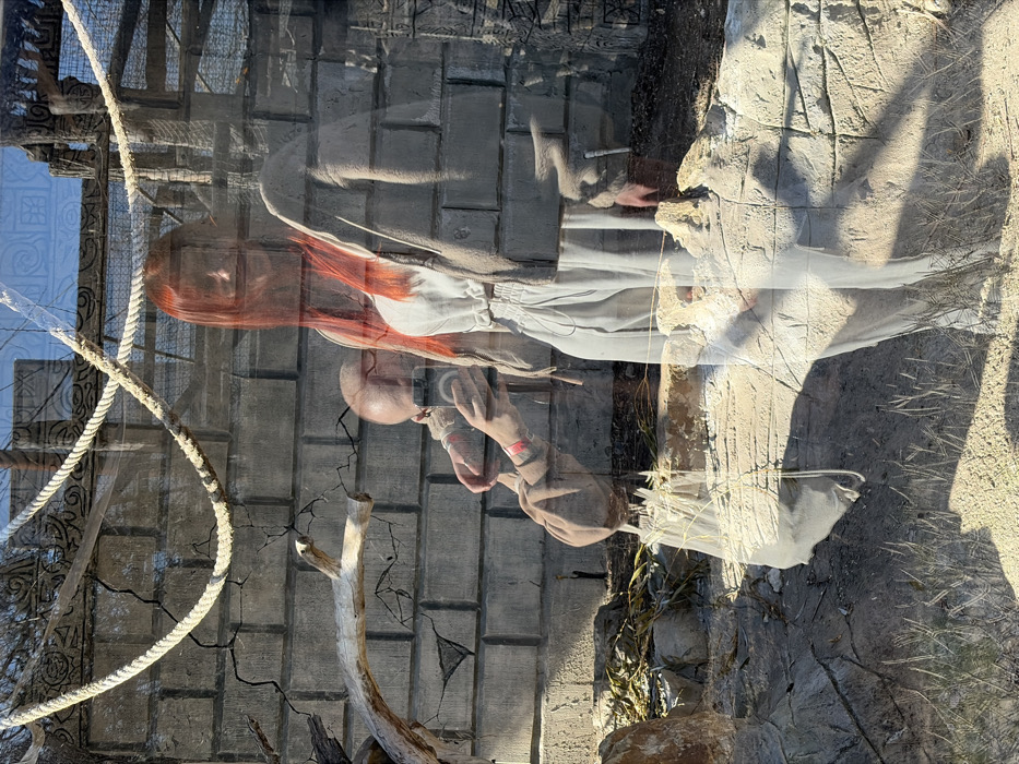 The image depicts a scene captured through a transparent barrier, showcasing both a reflection of two individuals and the animal enclosure beyond. The location is an animal exhibit within the city of Shakhty, Russia. In the foreground, two individuals are visible in reflection. On the right, a female with long, straight, bright red hair is wearing a light-colored (possibly off-white or light grey) crop top, matching sweatpants with a visible drawstring, and a light beige or tan long-sleeved jacket. Her face is partially obscured by the reflection but appears to be smiling. On the left, a bald male is holding a black smartphone with both hands, positioned to capture an image or video. He is wearing a long-sleeved light brown or beige shirt, and a red band is visible on his right wrist. The reflection indicates a sunny outdoor environment. Beyond the reflective barrier, the animal enclosure is visible. It features a backdrop of a textured wall designed to resemble grey, irregularly cut stone blocks, complete with simulated cracks. A thick, off-white rope stretches horizontally across the upper portion of the enclosure, serving as a potential climbing structure. To the left, a thick, light-colored tree branch or log extends into the frame. The ground within the enclosure consists of soil, various rocks, and sparse, dry grass or vegetation. In the upper right background, metal fencing or caging and decorative elements resembling castle crenellations are visible under a clear blue sky. No animals are present in the enclosure within the frame.