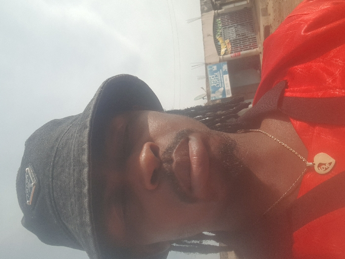 A man wears a dark bucket hat and a bright red shirt. He has dreadlocks, a mustache, and a short beard. A gold chain with a heart pendant hangs around his neck. The background shows a building with a storefront sign that says "BET". The sky is visible in the upper left corner, and the overall setting appears to be outdoors during the day.