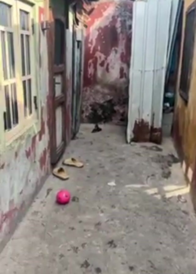 exterior of an old building, focusing on a narrow alleyway, a side exterior wall, and an open area with a corrugated metal roof. The alleyway has concrete flooring with peeling paint on the surrounding walls. There is a pair of yellow slippers and a pink ball on the ground. An old, leaning white metal object is visible along with some debris. The side exterior wall is peeling and stained with red and yellow paint. A black plastic tub sits against the wall. The open area has a long, concrete counter with cubby-like spaces underneath. The floor is tiled in a mosaic pattern. Various objects are placed on the counter, including a large piece of wood, some cloths, and a pink gas canister. The walls are weathered and stained. The metal roof allows sunlight to filter through.