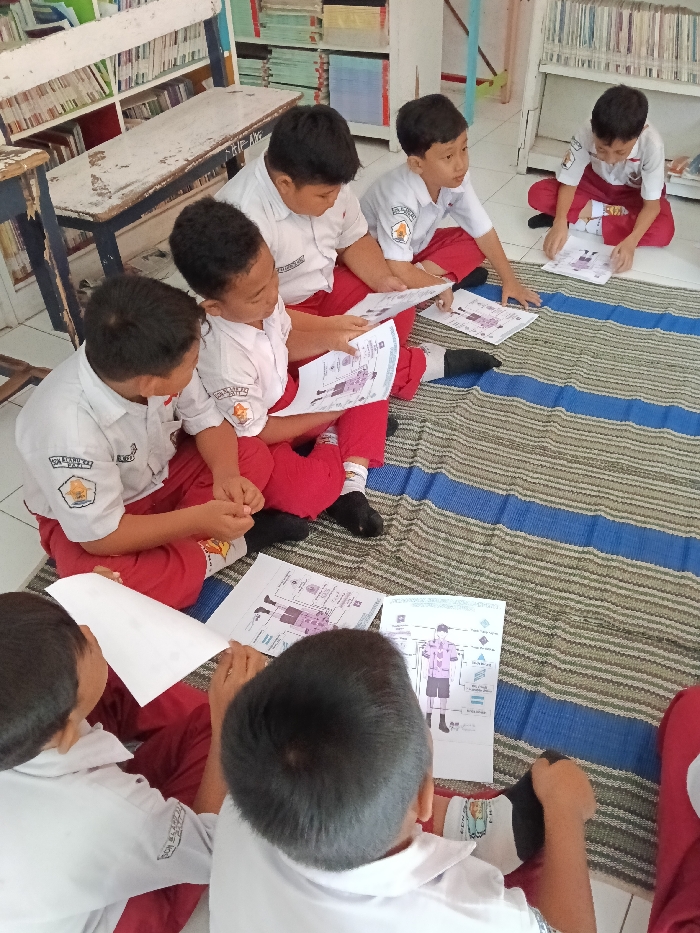 In a library setting, six children in school uniforms sit cross-legged on a blue and beige striped mat. They are engrossed in papers showing diagrams of people. Bookshelves line the background. The children appear to be studying or working on a group project, focused on the illustrations.