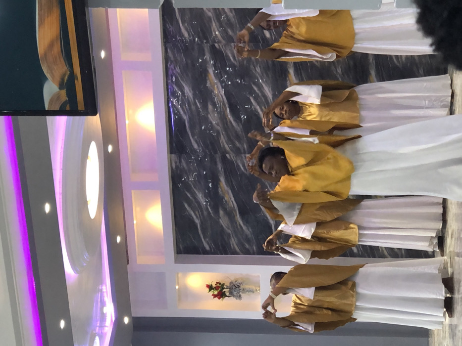 The image depicts an indoor scene within a modern religious building in Gbawe, Ghana