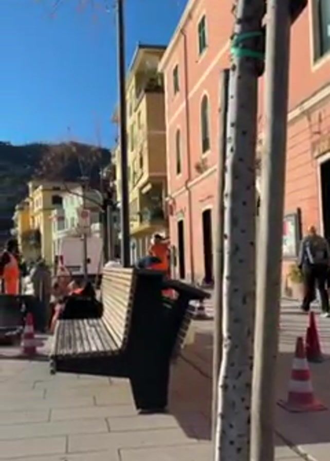 The camera focuses on a street in an Italian town. There are several workers wearing orange safety vests working on the pavement. There is a bench in the foreground, and construction equipment can be seen nearby. The buildings on the street are painted in various colors, including yellow and pink. There is a digital clock on a balcony that reads 14:53. The weather is sunny and clear. There are trees in the foreground. People walk by in the background.