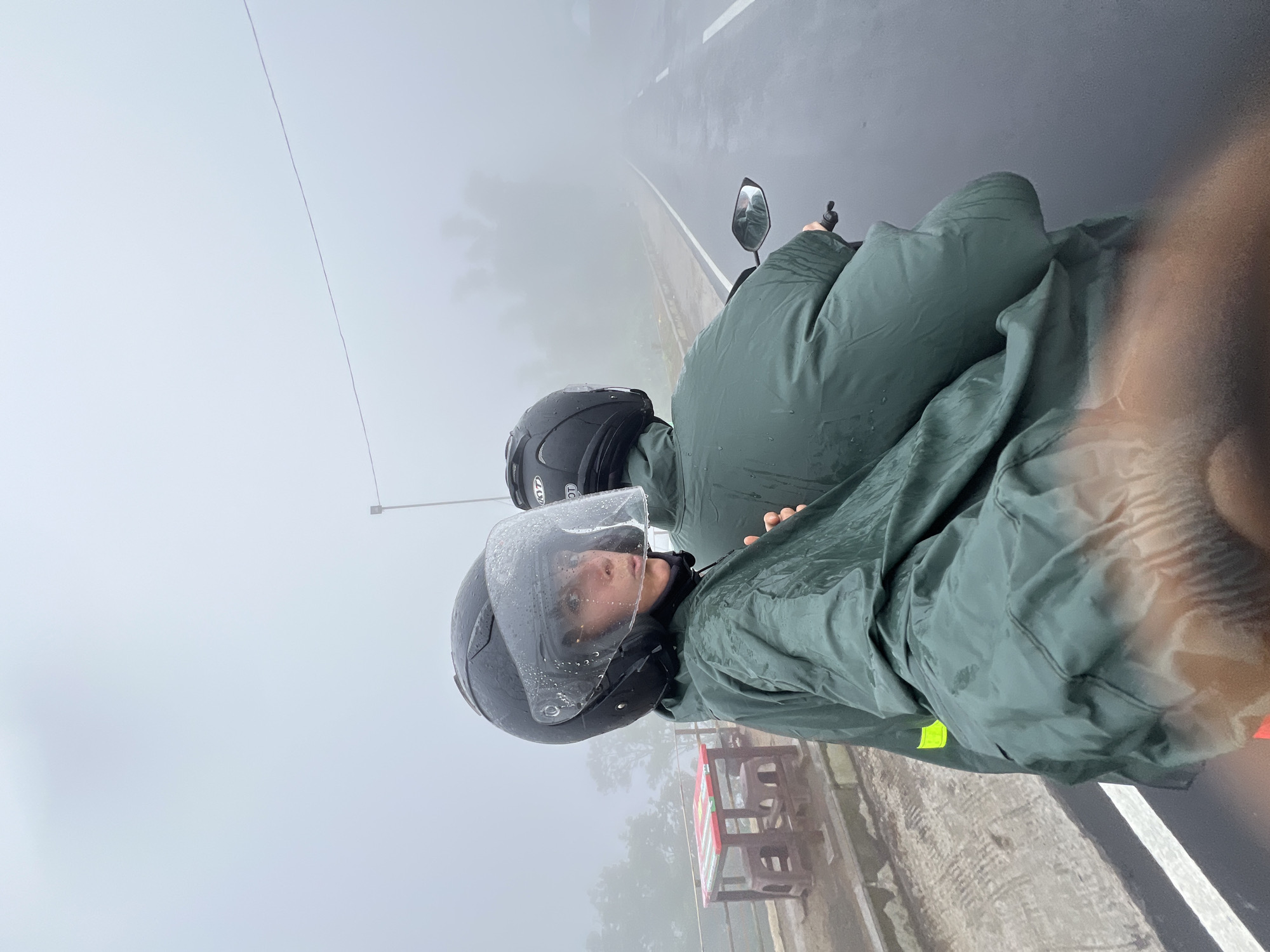 The image, captured in Wanagiri, Indonesia, shows two individuals on a scooter during a period of heavy fog or mist and apparent rain, evidenced by the wet road and water droplets on surfaces. In the foreground, the passenger, an adult wearing a dark green rain poncho with a yellow reflective band and a black full-face helmet with a droplet-covered visor, looks directly towards the viewer with her mouth slightly open. Behind her, the scooter's driver is visible from the back, also dressed in a dark green rain poncho and a black full-face helmet bearing "KTY" branding. The wet asphalt road, marked with a solid white line on the left and a dashed white line in the center, recedes into the dense, light grey fog. To the left, a low concrete barrier separates the road from an outdoor seating area containing a red-and-white checkered table and two reddish-brown plastic stools, all visibly wet. Distant trees appear as dark, indistinct silhouettes through the thick atmospheric conditions. A street light pole is present on the right, and a thin overhead cable spans the upper sky.