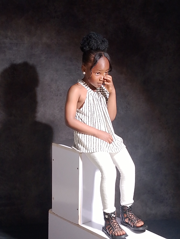 A young female individual of African descent is depicted seated on a white, two-tiered platform in what appears to be a photography studio setting