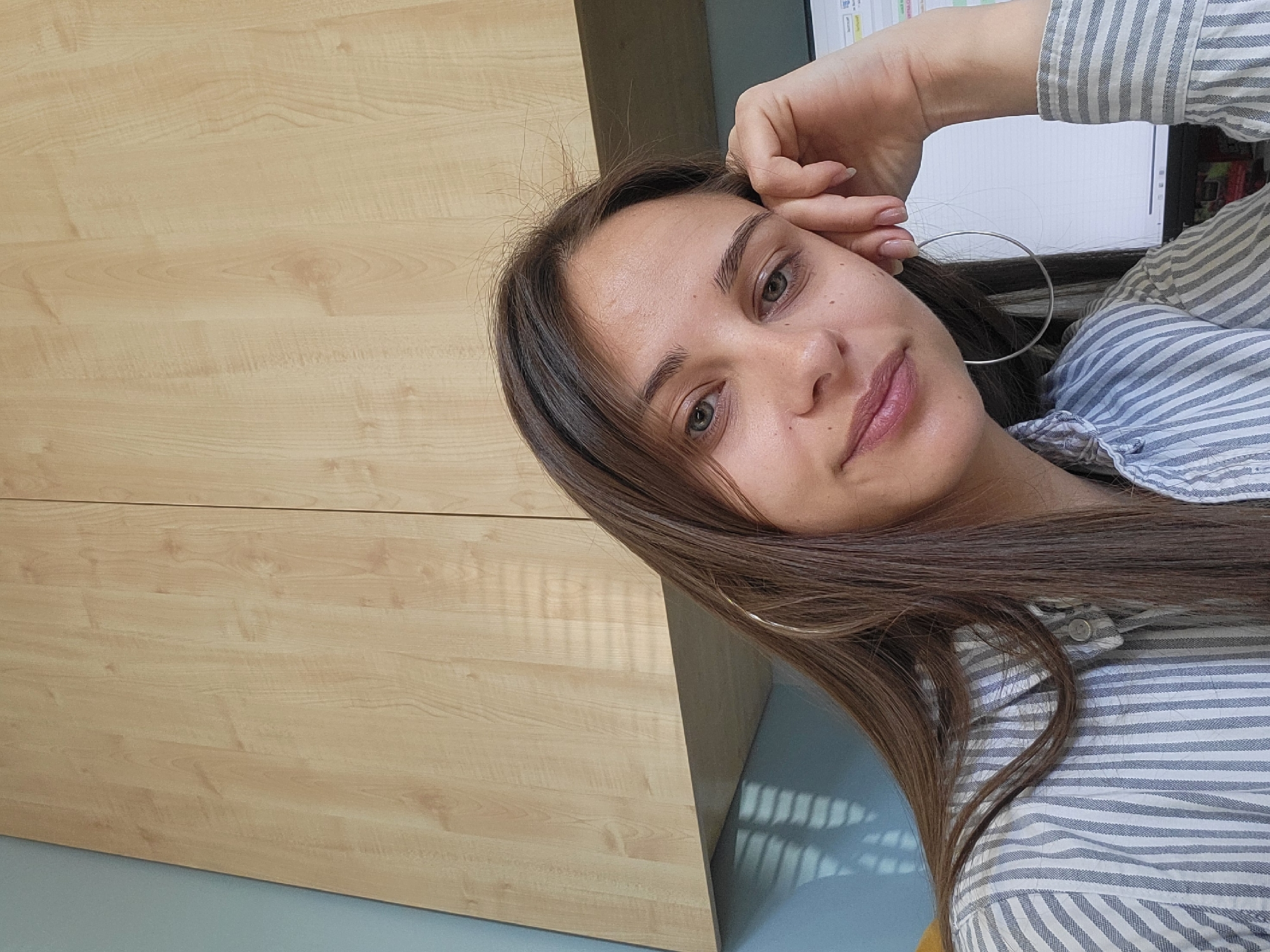The image displays an adult female subject positioned indoors, identified as being in Kragujevac, Serbia. The subject has long, straight, dark brown hair and light eyes, with a fair complexion and visible freckles. She is wearing a light blue and white vertical striped button-up shirt and large silver hoop earrings. Her left hand is resting against her left cheek, fingers slightly spread, and she is looking directly at the camera with a subtle smile. The background consists primarily of light-toned wooden cabinets with a horizontal grain, occupying the upper two-thirds of the frame. To the left and beneath the cabinets, a light blue wall is visible. Reflections of horizontal window blinds are cast onto the light blue wall and faintly onto the wooden cabinets. A portion of a computer monitor screen, displaying what appears to be a spreadsheet or data interface with text in a non-English script, is visible on the right side of the background, behind the subject's right shoulder. The overall environment suggests an office or workspace.