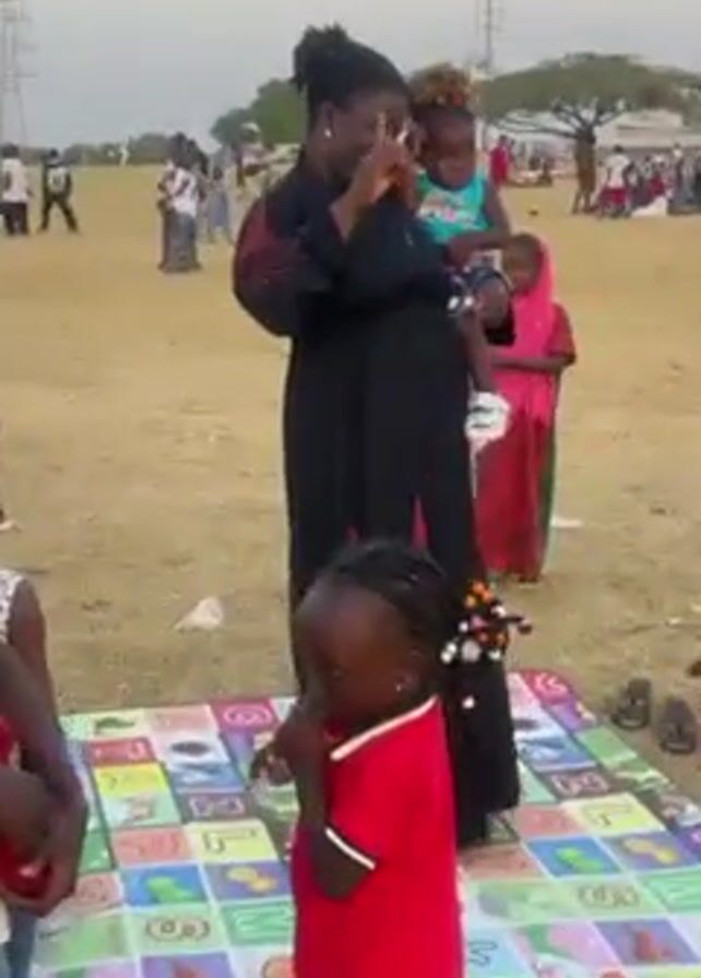 group of people in an open grassy area. Most of them appear to be children, standing around a woman who is holding a toddler. The woman is wearing a long black dress with red details and is pointing her finger up. The children are wearing various casual clothes. A colorful mat is laid on the grass in front of the woman. Other people are visible in the background, and there are some utility poles in the distance. The sky is overcast, suggesting it might be late afternoon or early evening. Several people seem to be taking photos or videos with their phones. There are a few trees scattered around the field.