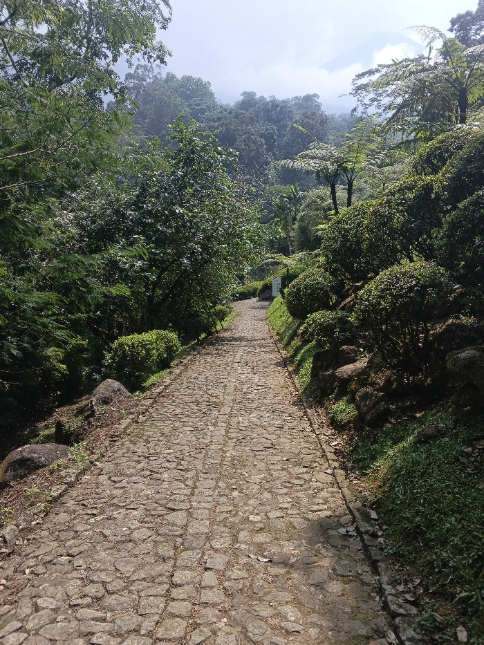 A winding cobblestone pathway leads through a lush, green landscape. Dense vegetation, including trees, shrubs, and ferns, lines both sides of the path. Sunlight dapples the stones, creating a play of light and shadow. The path gently ascends, disappearing into the distance among the trees. A hazy mountain range forms a backdrop to the scene, partially obscured by mist.