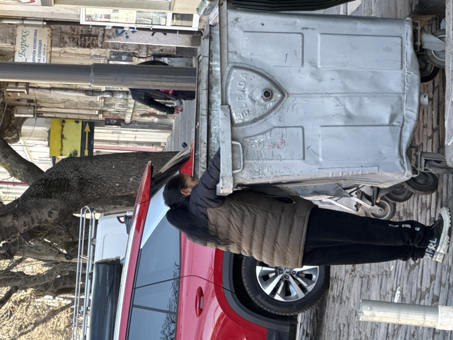 The image captures an urban street scene in Sofia, Bulgaria, identified near ul. "Stefan Stambolov" 63, characterized by cobblestone pavement. In the foreground, a female individual with dark hair in a high ponytail is observed leaning into a large, rectangular, grey metal dumpster, her arms extended within. She wears a two-tone quilted vest (dark upper, olive lower), black sweatpants with white "MFRL" lettering on the left leg, and black and white sneakers. The dumpster, bearing the embossed name "ЕЛПРИДА" (ELPIDA), is dented and stands on wheels. A red SUV with roof rails and a black cylindrical object on its roof is parked to the left, partially obscuring a white van. A grey metal bollard is visible on the far left of the cobblestone street. In the mid-ground, a male individual, partially obscured by a street lamp pole, walks away from the viewer, clad in a dark jacket and pants. The background features aged multi-story buildings; one displays a sign reading "Борекс БЪЛГАРСКА КОЗМЕТИКА И ЛИЦЕВА ЕПИЛАЦИЯ" (Borex Bulgarian Cosmetics and Facial Epilation). Bare tree branches and a yellow directional sign with a black arrow pointing left are also present.